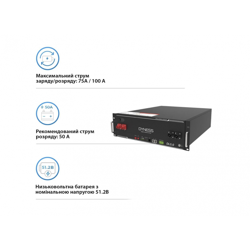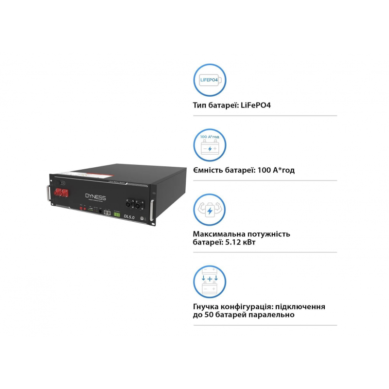 Dyness DL5.0 — низьковольтна LiFePO₄ батарея 51.2 В для систем накопичення енергії. Використовується у гібридних та автономних сонячних електростанціях, а також у системах резервного живлення.