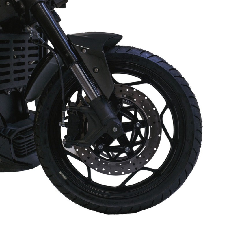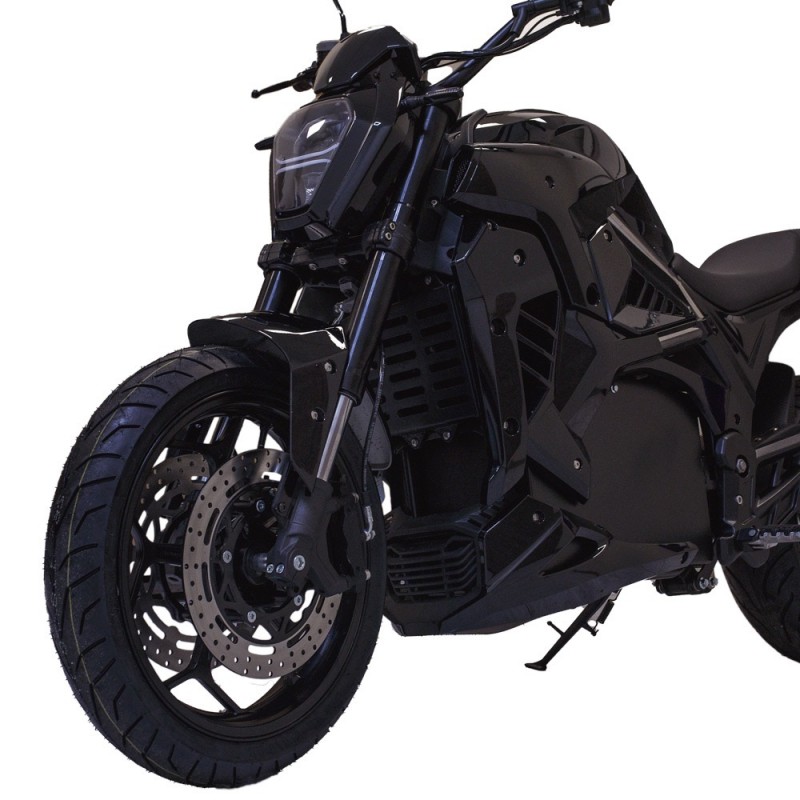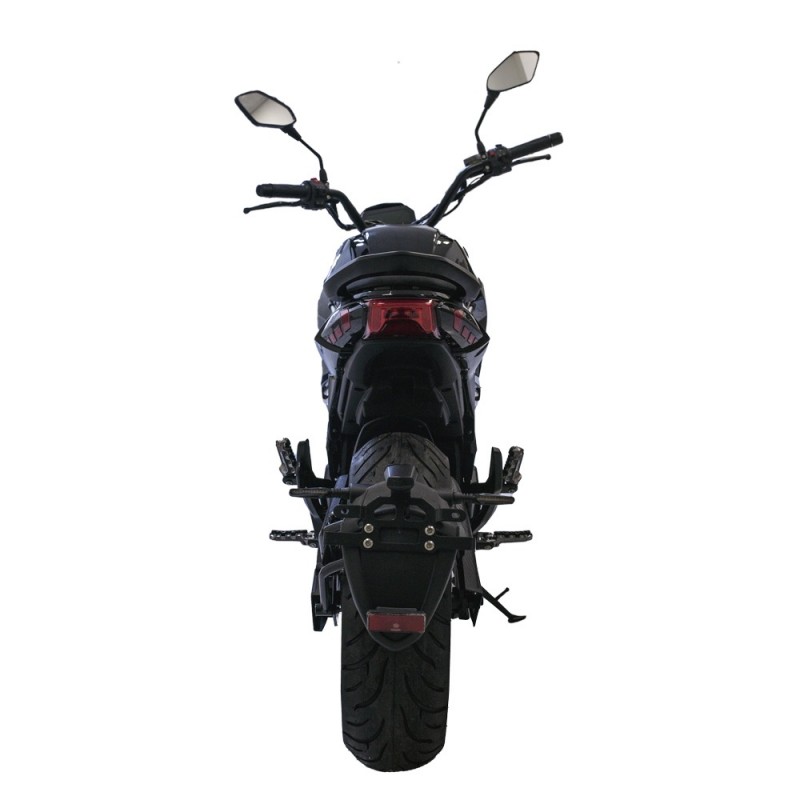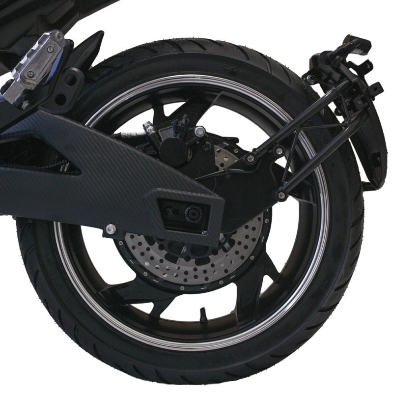 Електроскутер оснащений колесами з оптимальними параметрами для стійкості та комфорту: переднє колесо 110/70-17, а заднє — 200/55-17. Така конфігурація забезпечує стійкість і надійне зчеплення з дорогою за будь-яких умов. Максимальна швидкість досягає 110 км/год, що робить його чудовим вибором для тих, хто цінує швидкість і мобільність.
