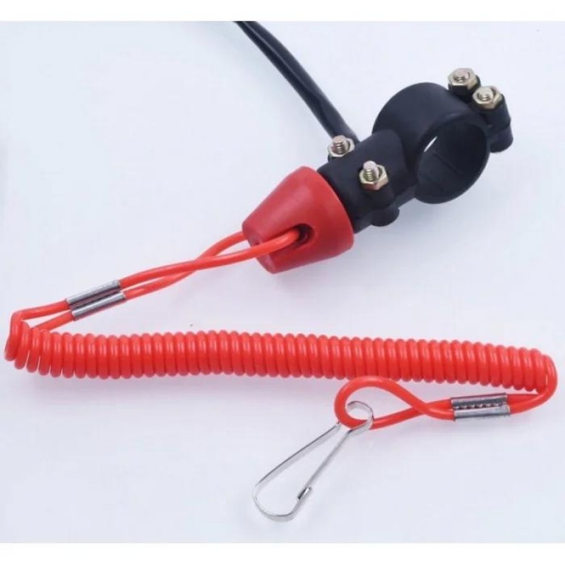 - Аварійна кнопка, що повністю зупиняє роботу двигуна. Зовні виглядає як кнопка з довгим повідцем та карабінчиком, закрита запобіжним ковпачком. Саме він замикає електричний ланцюг подачі енергії на свічку, що дає іскру. Карабінчик прикріплюють до одягу водія, і якщо дитина під час їзди випустити кермо, відхилитися назад або в одну зі сторін, повідець зірне запобіжний клапан і розімкне ланцюг подачі живлення, а двигун відразу ж затихне. Для старших водіїв така сама запобіжна кнопка розміщена на лівій рукояті керма, щоб можна було самому реагувати на небезпечну ситуацію та оперативно зупинити рух