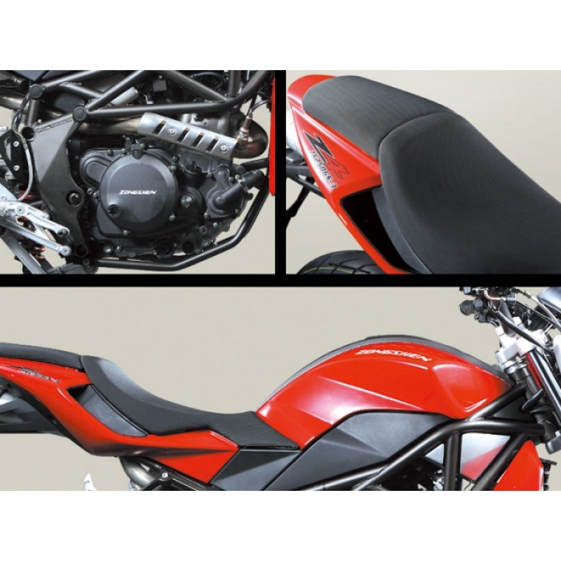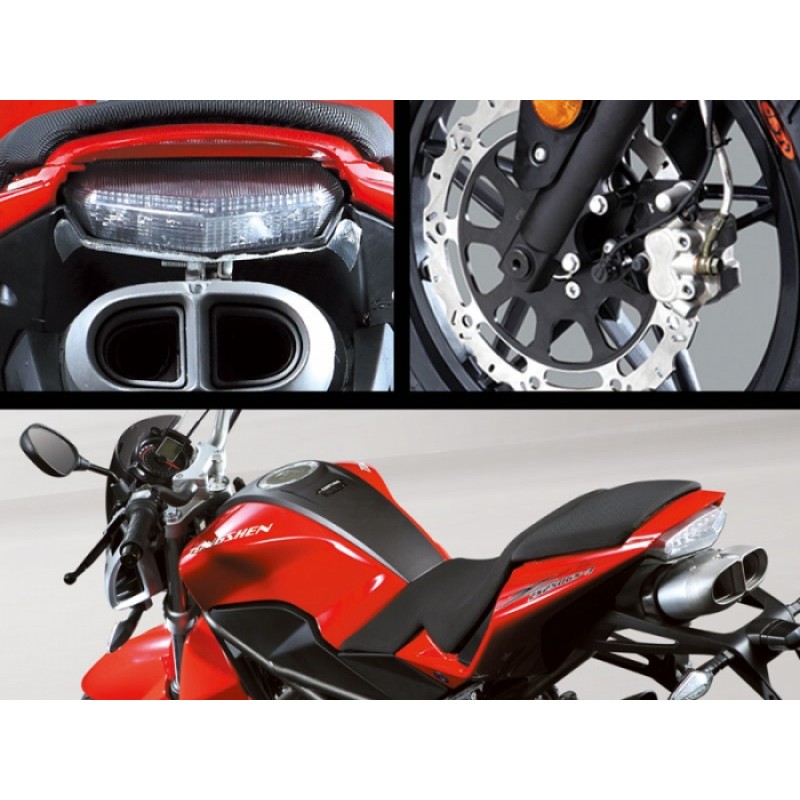 Zongshen ZS250GS-3 - одна з примітних моделей спортивної лінійки мотоциклів Zongshen, що має свої переваги і особливості. Першочерговим, відразу впадає в очі, є значний обсяг двигуна - 250см куб. Невеликий «табун» з 25 к.с. буде нести на максімальнай швидкості в 140км / ч. При цьому, витрата палива становить близько 4л / 100км. При такому обсязі і потужності, незамінним стає, що використовується в даній моделі, рідинне охолодження, завдяки якому силовий агрегат захищений від перегріву при тривалій експлуатації. Передня підвіска представлена гідравлічної виделкою, а задня (прогресивна) - маятником і моноамортизатором. Завдяки цьому, знижується вібрація і биття при їзді. мотоцикл Zongshen ZS250GS-3 оснащений електронною системою пуску і електричним запалюванням. Дана модель вкрай підходить для міських умов і поїздок на великі дистанції. Додаткова інформація доступна по телефону.