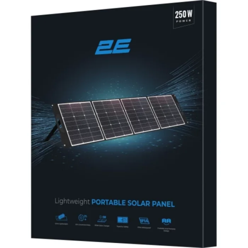 Портативна сонячна панель 2E – це компактний «помічник», що збирає сонячну енергію і перетворює її на електричну, тому стане в нагоді для заряджання різних типів пристроїв при недоступності електромережі. Панель має попит серед любителів активного відпочинку на природі, також буде корисна і військовим на фронті, адже забезпечує можливість відновлювати заряд важливих пристроїв на кшталт GPS-навігаторів, рацій, смартфонів, акумуляторних батарей і т.д. Модель 2E PSPLW250 має потужність 250 Вт, високий коефіцієнт конверсії на рівні 22-23,5% і складається із чотирьох секцій. При вазі 6,12 кг розмір панелі становить 560 × 565 × 50 мм – досить компактна та легко уміститься у туристичному рюкзаку. У розкладеному стані пристрій має значно більшу «робочу» поверхню – 3035×560×25 мм, до того ж конструкцією передбачені зручні рукоятки та опори для встановлення під оптимальним кутом нахилу. Щодо роз'ємів: модель оснащена MC4, Anderson, XT60, DC5.5 для з'єднання сонячних панелей між собою та іншими компонентами системи, зокрема інверторами або контролерами заряду.