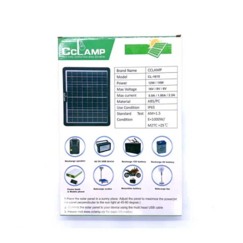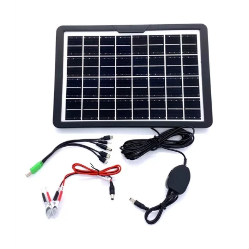 Вологозахищена сонячна панель потужністю 15W. Корпус панелі виконаний із пластику та має ручку для монтажу панелі під необхідним кутом до сонячних променів. Панель має два роз'єми USB для підключення або підзарядки гаджетів. Також має роз'єм для заряджання гучномовців, набір кабелів з різними роз'ємами для заряджання гаджетів та клемами для заряджання акумуляторів.